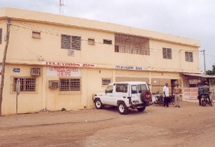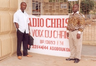 A picture of the building for Christ Radio in Lome, Togo, West Africa. John Egbe and the station manager are standing beside the building.